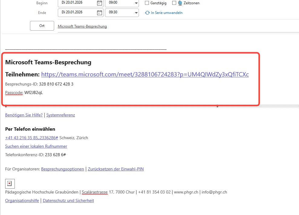 Microsoft Teams verfügt über eine Funktion, wo mit externen Benutzern (keine Mitarbeitenden der PHGR) eine Besprechung stattfinden kann. Hierfür muss vorgängig die Teams App installiert sein.