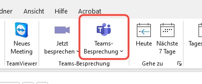 Button "Neue Teams-Besprechung" fehlt in Outlook Nach der Installation der Teams App dauert es einen Moment bis der Button in Outlook ersichtlich ist. Outlook muss nach der Installation der App neu gestartet werden.