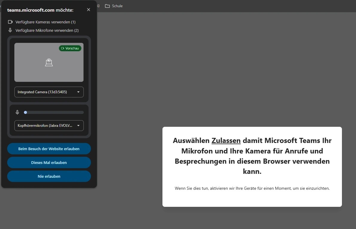 17. Im Web teilnehmen: ist die einfachste Lösung wenn der Teilnehmer noch nicht mit Teams arbeitet. Dazu muss Zugelassen werden, dass Microsoft Teams auf das Mikrofon sowie die Kamera zugreifen kann.