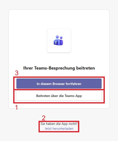 Teilnehmer hat kein Teams: Hat der Teilnehmer kein Teams kann entweder die App heruntergeladen (2) oder im Web teilgenommen werden (3).