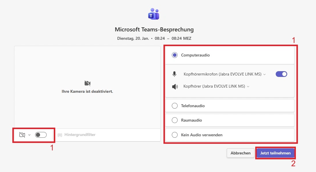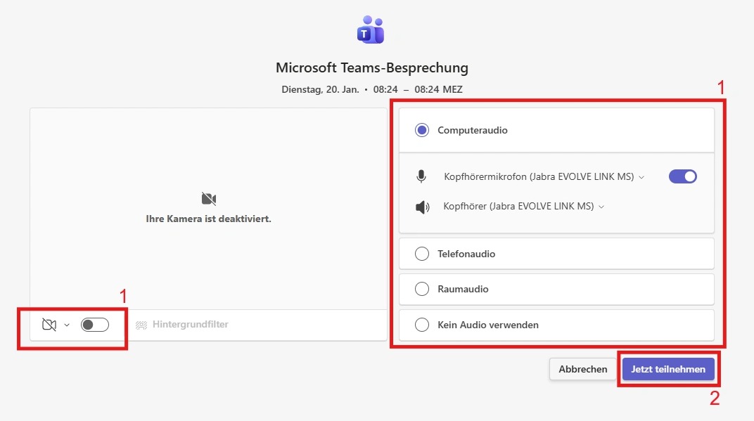 9. Wählen Sie dann aus, ob die Kamera und/oder das Mikrofon aktiviert sein sollen (1) und klicke dann auf Jetzt teilnehmen (2).