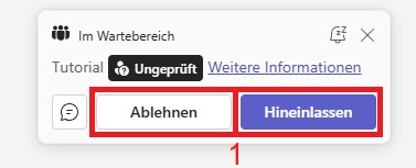 10. Sobald ein eingeladener Teilnehmer dem Meeting beitritt wird dieser im Wartebereich angezeigt. Sie können nun Teilnehmer im Wartebereich "Hineinlassen" oder "Ablehnen"(1).