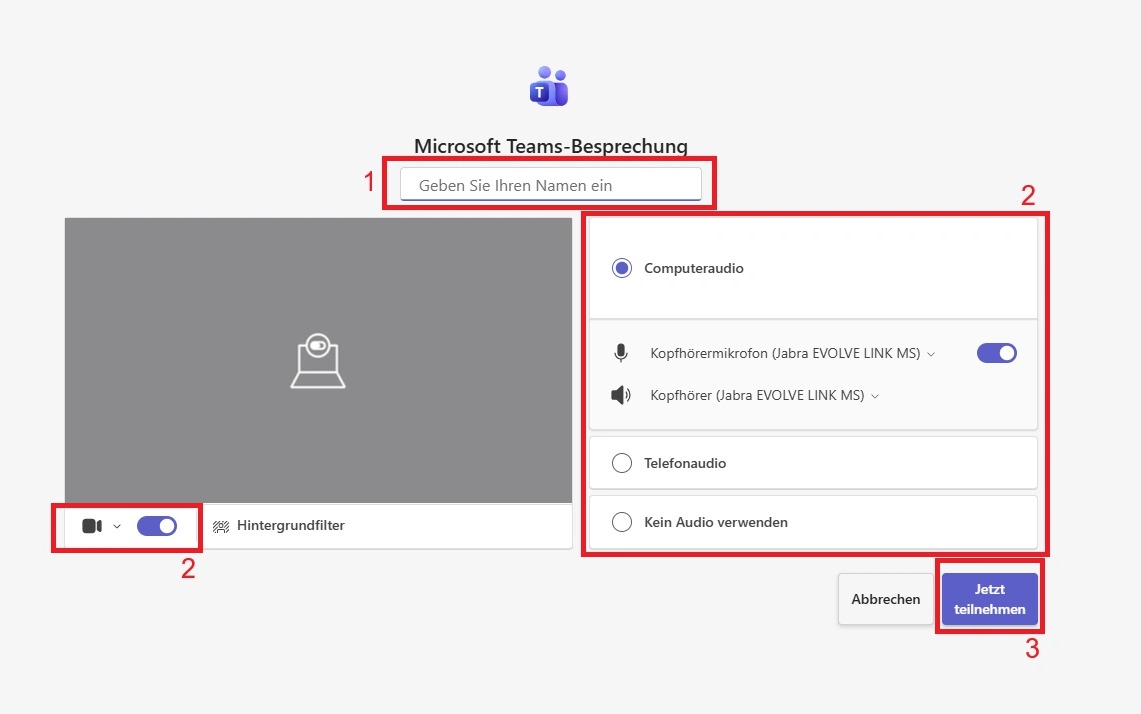 18. Nun kann er seinen Namen eintippen (1), auswählen, ob die Kamera und / oder das Mikrofon aktiviert sein sollen (2) und danach auf Jetzt teilnehmen (3) klicken.