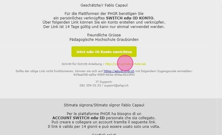 3. Sollte der direkte Link nicht funktionieren, können sie sich auf der Seite https://eduid.phgr.ch manuell mit dem erhaltenen Code anmelden. Den Code können sie aus dem Email kopieren.
