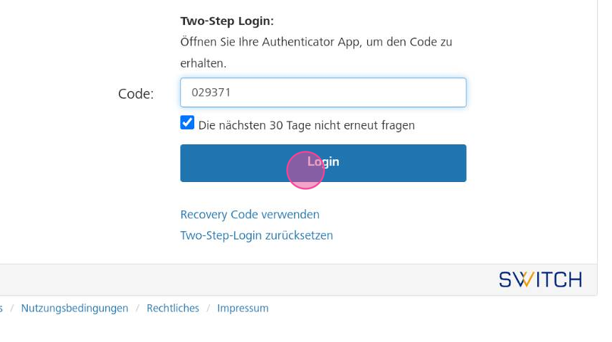 8. Geben Sie nun Ihren Two Step Login Code ein, der befindet sich in Ihrer authenticator App.