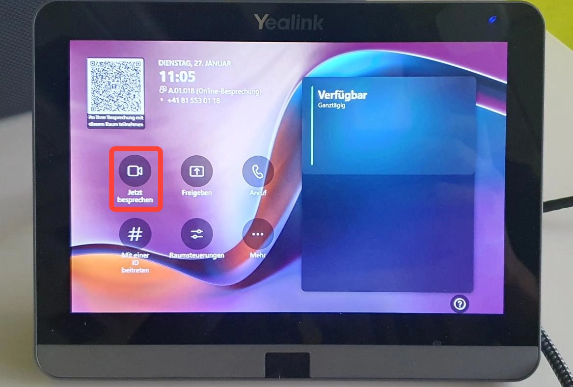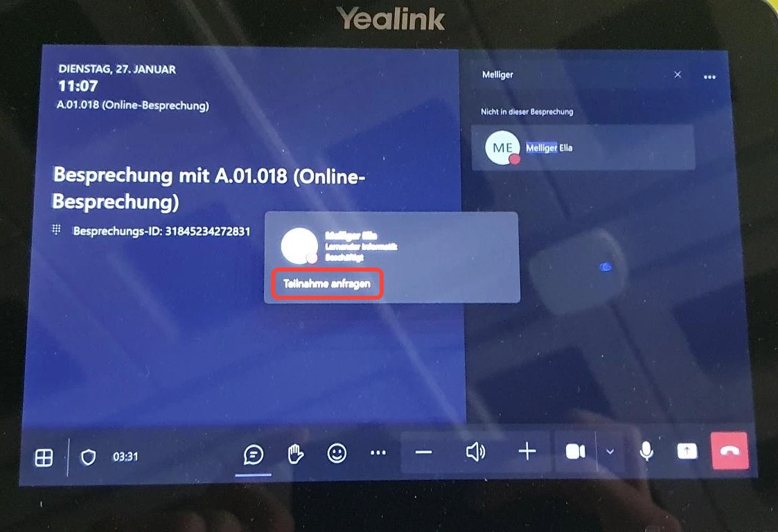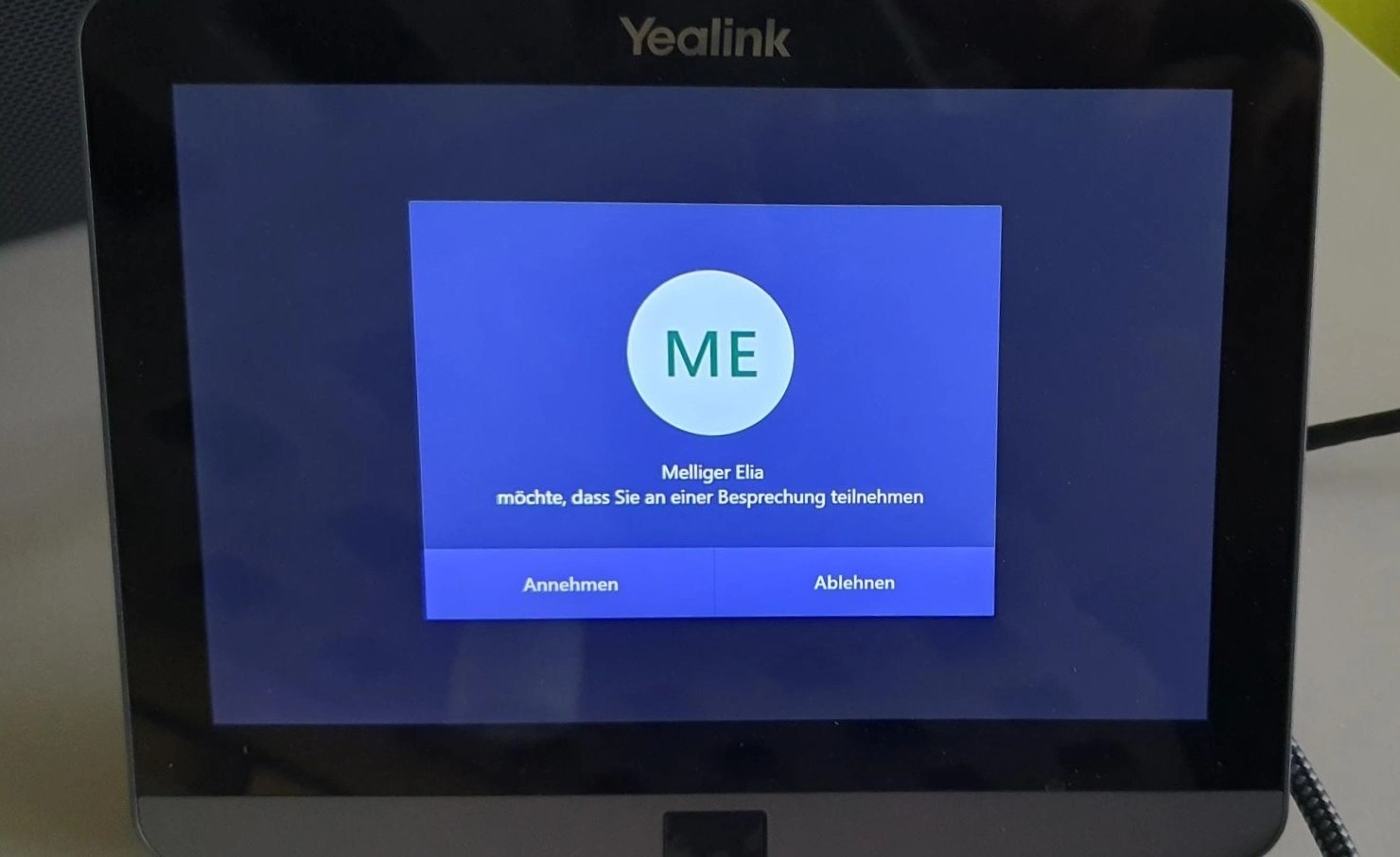 6. Es klingelt im Sitzungszimmer, jemand muss nun die Teilnahme vorne am kleinen Yealink Bildschirm bestätigen Das Sitzungszimmer ist jetzt auch ein Teilnehmer der Besprechung