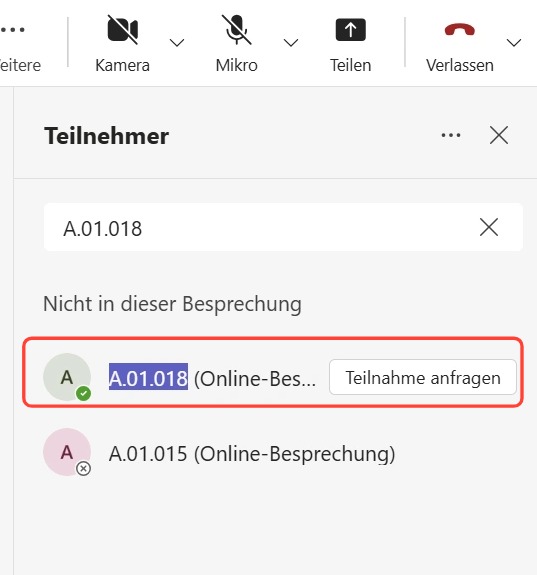 5. Suchen Sie in der Teilnehmerliste das Sitzungszimmer A.01.018 und laden sie es zur Besprechung ein